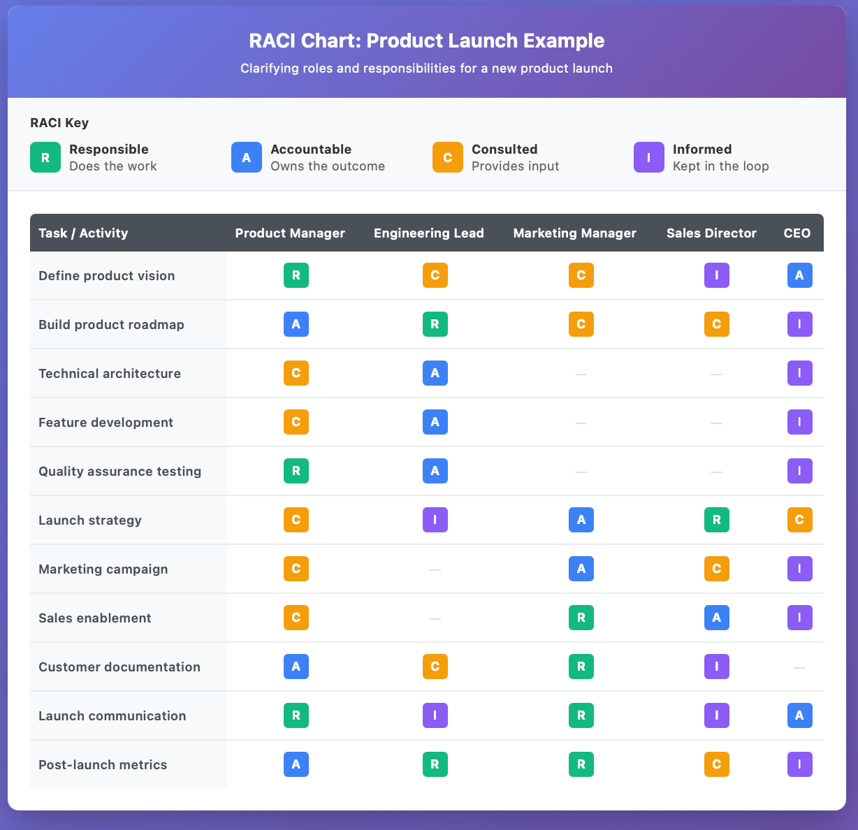 This makes it ideal for product launches, feature prioritisation, and cross-functional initiatives where accountability tends to blur.