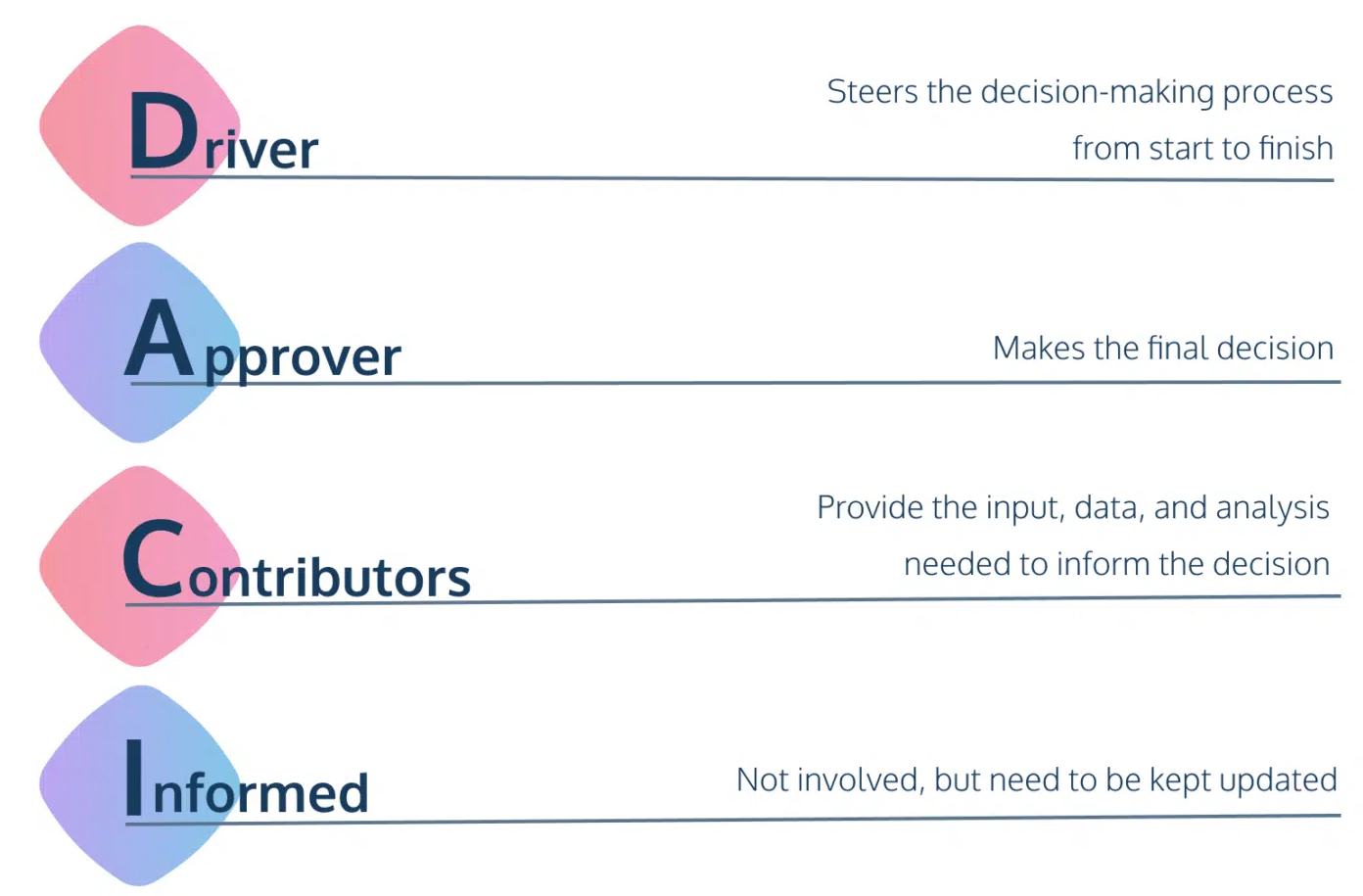 DACI stands for Driver, Approver, Contributor, and Informed, roles that clarify authority in specific situations.