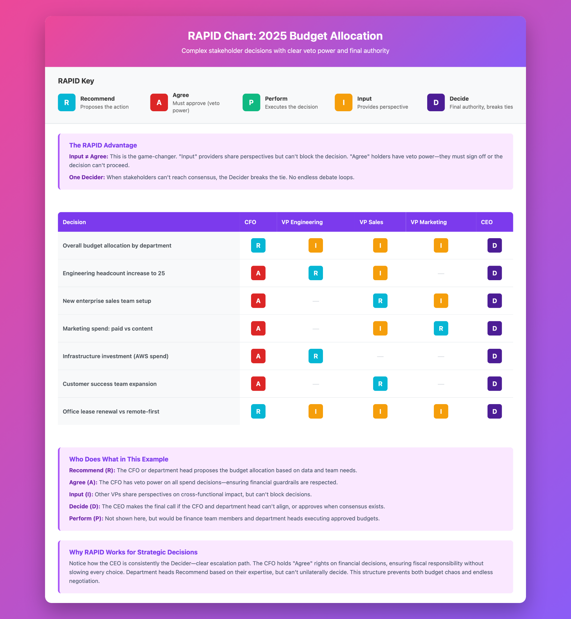 RAPID excels in organisational decisions with broad impact: budget allocation, strategic pivots, major hires, or partnership agreements.