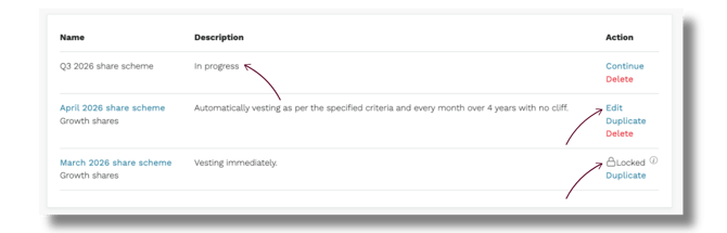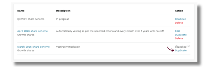 Tip: To base a new scheme on an existing locked one, click Duplicate. This copies the scheme's rules (vesting schedule, criteria, etc.) so you don't have to start from scratch.