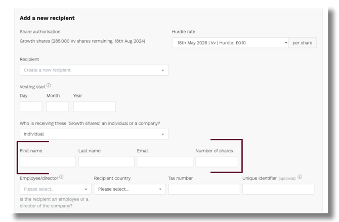 Enter their first name, last name, email address, number of growth shares,