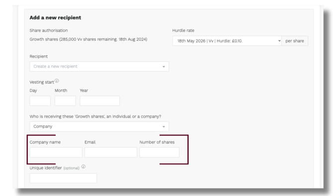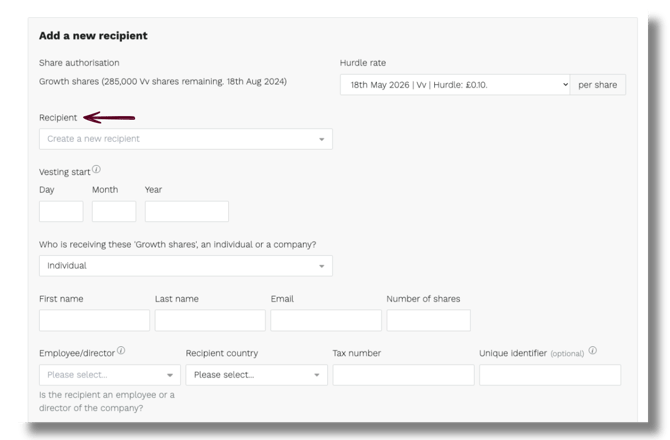 Once the scheme is created, you'll land on the recipients page. This is where you add the people or companies receiving growth shares.