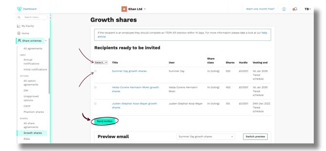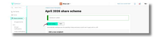 - Click the scheme name (e.g. April 2026 share scheme) to go to the add recipients’ page, enter the recipients information and send out the growth share invites.