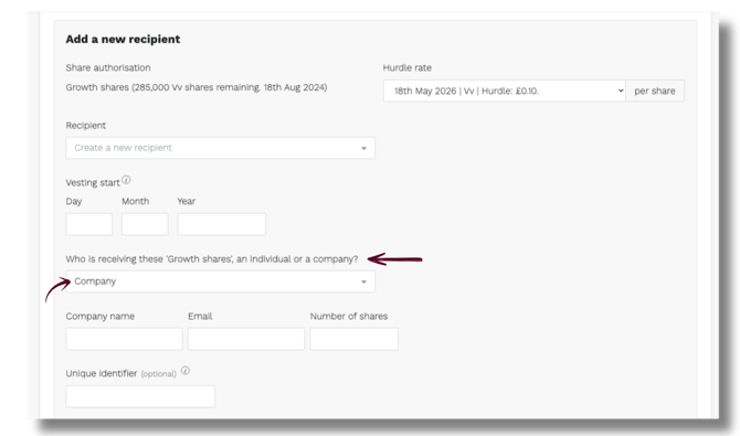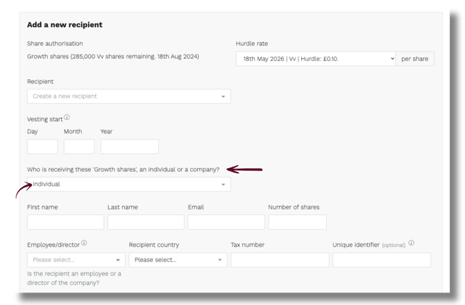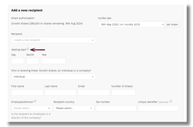 3. Enter the vesting start date, then select whether the recipient is an individual or a company.