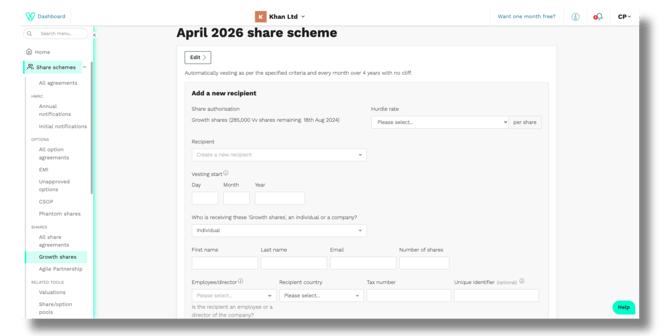 You'll be taken to the growth share scheme builder, where you can customise the scheme to fit your requirements: how shares vest, any criteria recipients must meet, vesting frequency, and more.