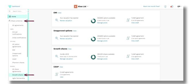 Log in to Vestd and navigate to Share schemes > Growth shares via your homepage or side navigation bar.