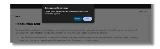 - To proceed and immediately send the resolution to the signatories, click 'OK'.