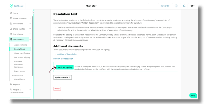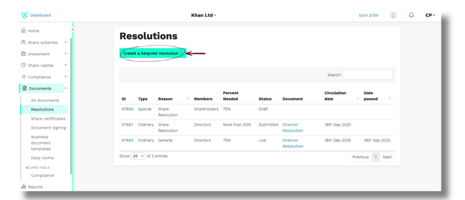 After you have sent the Directors' Resolution, navigate to the bespoke resolution creation page and add the details for your Shareholder Resolution.