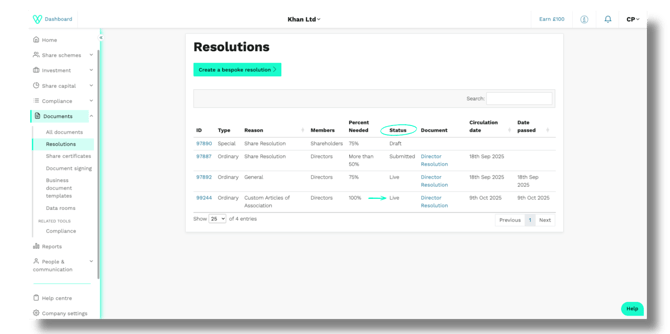 Once the resolution has passed (meaning it has reached the required percentage pass rate), its status will also update to 'Live' on the Resolutions page.
