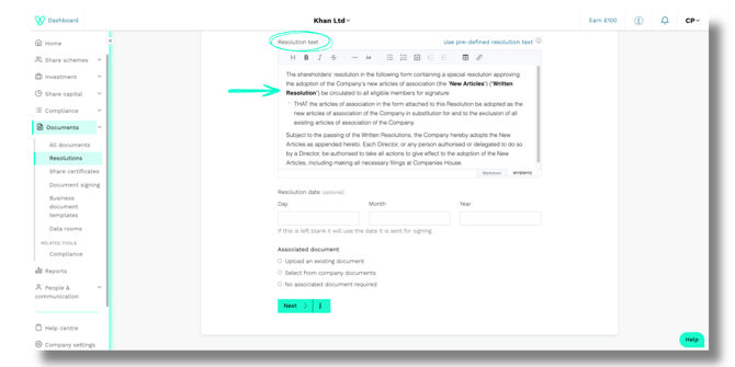4. Resolution text: Paste or draft the wording that will be sent for signing