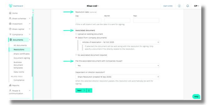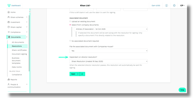 Scroll down and use the 'Dependent on director resolutions?' dropdown menu to select the specific Directors' Resolution your Shareholder Resolution relies on.