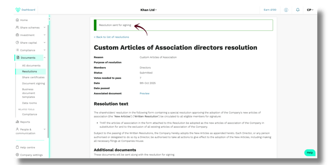 - Preview the resolution and any attached documents (e.g., articles of association).